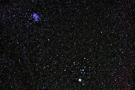 Anyway, I decided to leave Cassiopeia for another time, and went instead for some shots of the Pleiades and Hyades together in the same frame. The polar alignment was on target enough that I was getting really stable 11 minute exposures...which is good since I had stopped down the aperture. Here is the result after dark frame, stacking and flat field work in Photoshop.