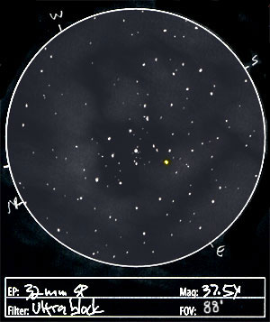 This is really an incredible nebula from a dark site. While the nebulosity is only hinted at without a a filter, once the Ultrablock filter is inserted, its beautiful form really takes shape. The central region is home to a bright, but sparse open cluster and is mainly clear of nebulosity, with softly glowing petals of light encircling it. The brightest portion of the nebula appeared to be north of the core, and the western quadrant appeared to be lacking in stars. A bright yellow star sparkled just east-southeast of center as shown in the sketch.