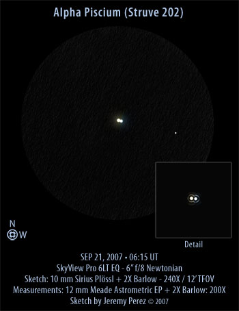 The first diffraction ring on the primary of this close double appeared to fall just short of bisecting the center of its companion. I estimated a separation of 1.4 arc seconds; however, Brian Workman's Double Star Calculator gives 1.78 arc seconds. My PA measurement worked out to 268 degrees, which compares well with the calculated PA of 266 degrees. Color was pretty difficult to pick up, but appeared to be pale yellow and pale blue.