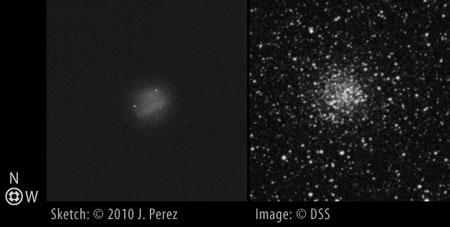This arrow asterism is still readily apparent in the low power telescopic view with my 32 mm Plossl. By nudging the arrow to the western edge of the 1.4 degree-wide view, NGC 6712 can be paired with it. At 120X through the Pentax XW10, it appear to be on the verge of partially resolving with an almost granular flicker that the seeing wouldn't allow to improve. At 240X, the subtle flickering of faint stars was a bit easier to detect, with one star on the east side being the most persistent. It appeared to be about 2 arc minutes in diameter with a structure that was somewhat mottled. There was a noticeably brighter clump on its west-northwest quadrant, and overall, it was not quite circular--appearing to be strangely cut off on its south-southwestern edge.