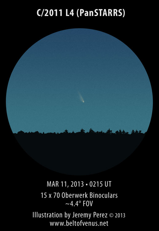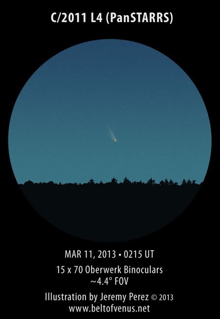 The comet finally came into view about 7:00 PM with the sun 7 degrees below the horizon and the comet 6 degrees above. It was a beautiful white fan over a gray-blue sky. The central condensation appeared elongated with the brightest section of the tail on the right (north) side. There was a hint of a fainter, shorter tail on the left (south) side. I roughly estimated overall visible length at around half a degree. I tried spotting it naked eye, but couldn't confirm a couple suspected glimpses.