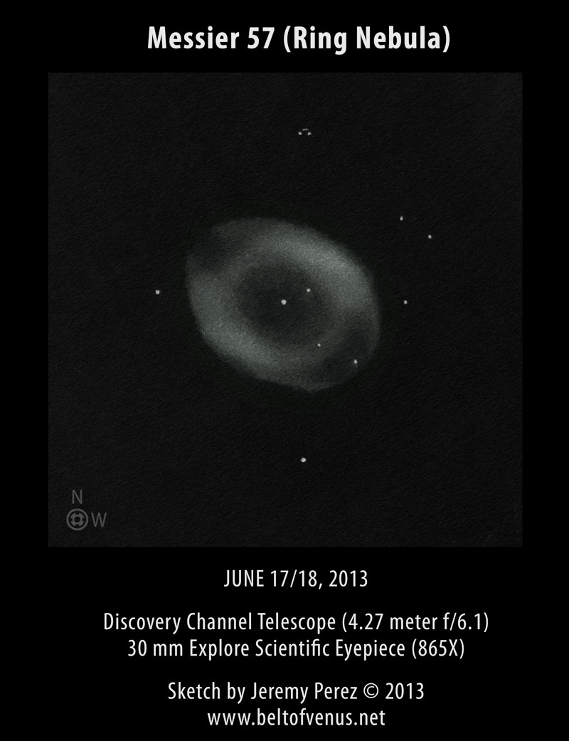 Beautiful sketches! I had an evening once on the 2.3m Bok telescope on Kitt Peak. The field of view is tiny, planets and planetary nebulae are the best targets. We viewed Jupiter and several nebulae. The detail in the Saturn nebulae was stunning, the subtle colors were surprising too, not just OIII green with a large 'scope. Your drawing of the Cat's Eye brought back those memories for me... Thanks!