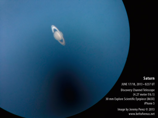 As twilight darkened, Saturn was the dramatic warm-up act. At 865X the crisp, bright, huge view of the planet was a foreshadowing of great things to come. I decided to embarrass the entire group by taking a few quick iPhone photos through the eyepiece. Tom was prepared for a more professional approach and while we waited for the sky to get darker, he hooked up his imaging equipment and captured some video for processing later.