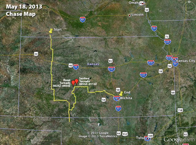 My initial target was the vicinity of Ashland in far south Kansas. After noting where development was occurring along the dryline, I moved up to southwest of Greensburg and waited for convection along this section of the dryline to take off. I followed a cell that finally started to strengthen southeast of Spearville. And it eventually produced two tornadoes near Rozell and Sanford.