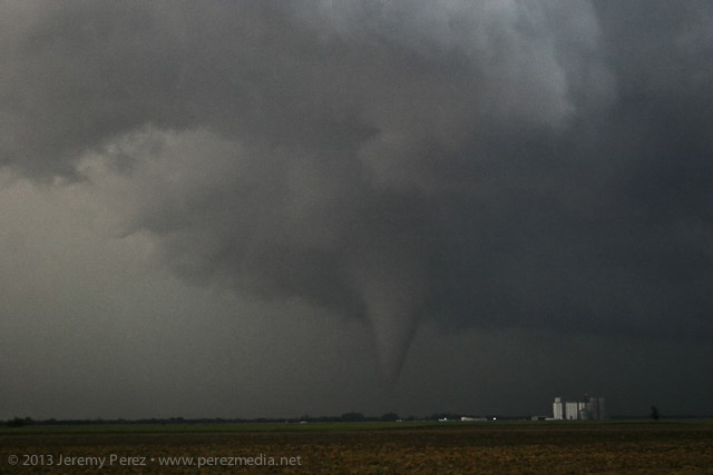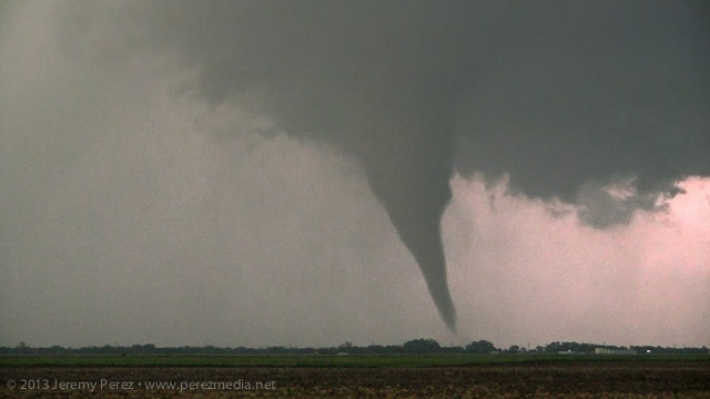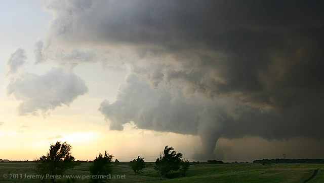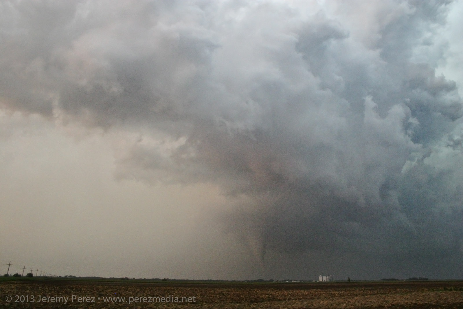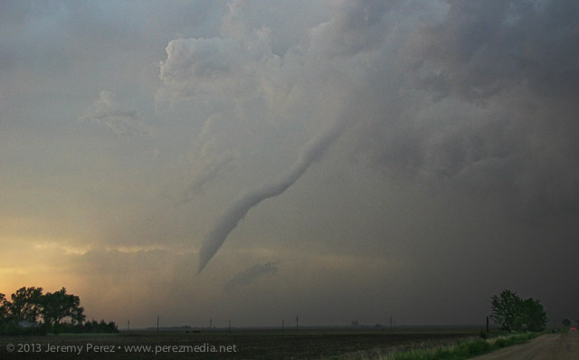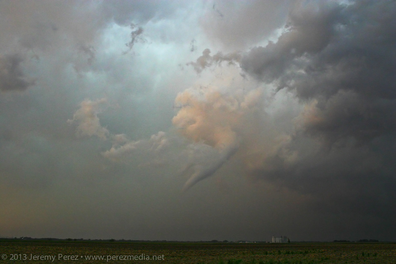 About 5 miles southwest of Rozel, it started winding up a funnel that gradually made its way to the ground and grew into a sturdy, long-lived tornado spinning away behind a remarkably clear RFD slot.