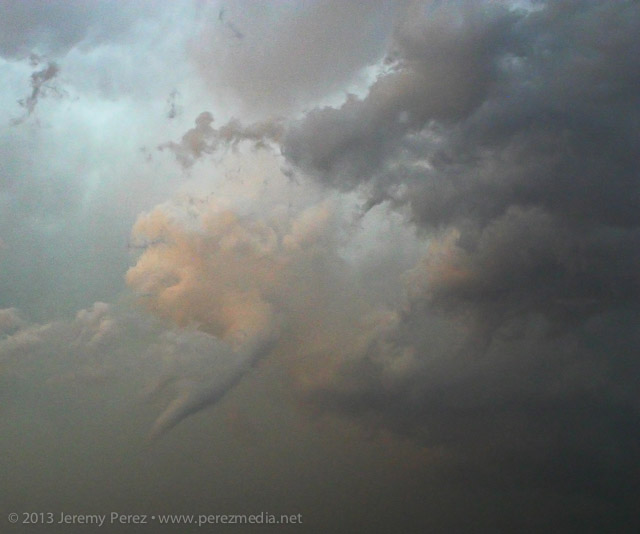 Just when I thought it was done, I called my wife to see how things were going and talk about everything I had just seen. While talking on the phone, this floating earthworm of a funnel suddenly popped into view, off to the northwest. Just this cool little disembodied funnel twisting around, way west of its parent storm. Circulation was still on the ground as it drifted westward before finally winking out.