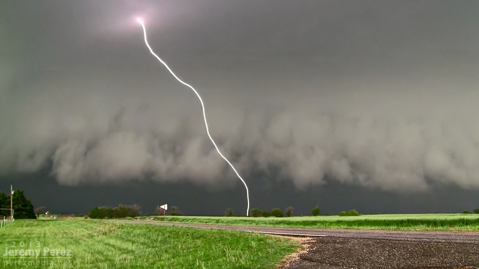 As storms matured, I made my way toward a cell approaching Oxford, Kansas. By the time I was positioned east of Oxford, the storm was HP and had a tornado warning. The look of the storm was incredibly menacing. The forward flank was lofting a ragged, low shelf that had the train-like appearance of an inflow tail as it led into the sealed notch between forward and rear flanks. Positive lightning strikes were landing just ahead of it and casting off fearsome canon-shots of thunder.