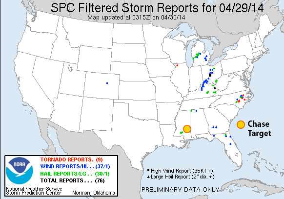 [Edit/Update 2230Z:] An ongoing MCS from yesterday’s storms on the gulf coast has not given up all day. Outflow and massive anvil cirrus has kept the southern two-thirds of Alabama and southeastern quadrant of Mississippi from heating up and reaching forecast instability. Storms have been trying to get going ahead of the cold front across Mississippi—much later than anticipated—but struggling much of the past couple hours. One storm about 70 miles southeast of my target area has picked up a tornado warning and is moving roughly eastward. It’s pretty strung out, the velocity couplets look anemic to my eye, and it’s not moving into better instability. So hard to say if it will last long.