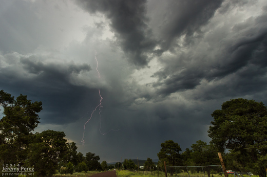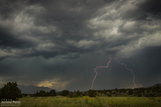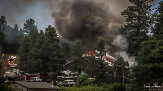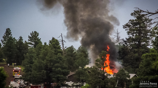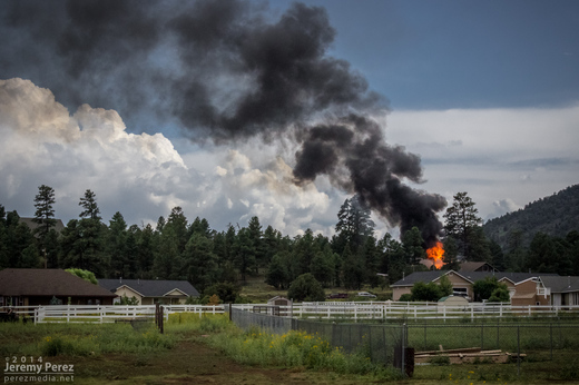 On my way home after photographing monsoon thunderstorms northeast of Flagstaff, I noticed smoke rising over the hills along Townsend-Winona Road. I thought it might be another tree fire, but as I rounded a bend, it turned out to be a terrible house fire. Checking radar, it looks like there were 3 lightning strikes over that location from 2:45-3:00 PM. Several fire trucks were on the scene but the fire was overwhelming and it took quite a while before it seemed to be brought under control. I’m afraid the house may have been completely lost.