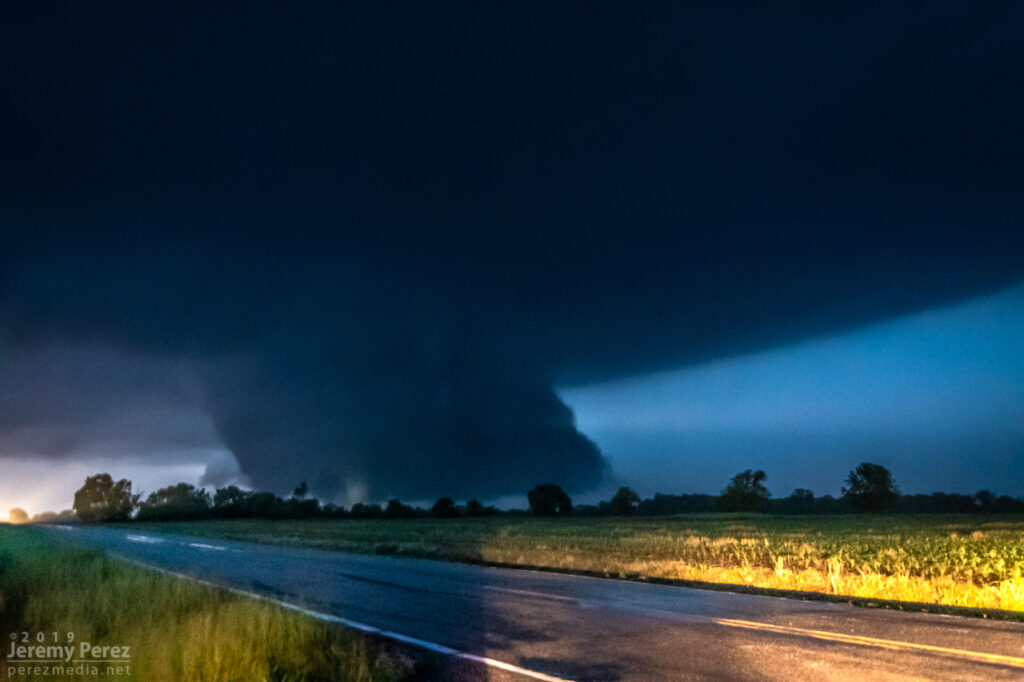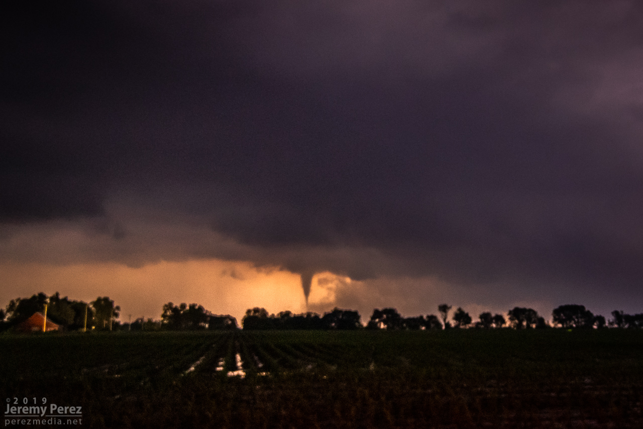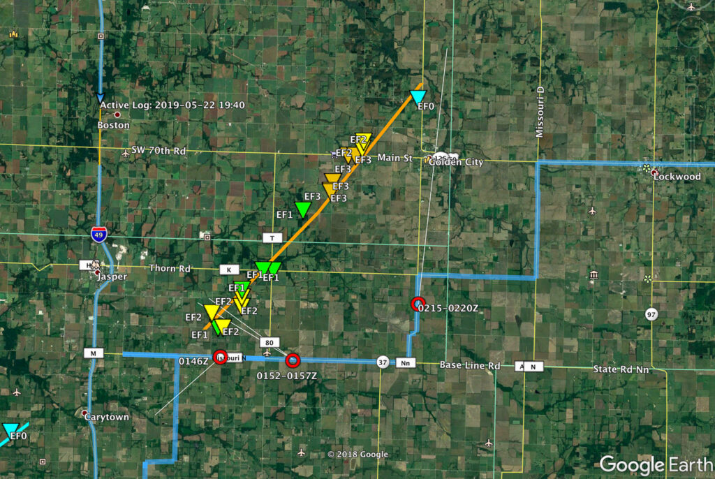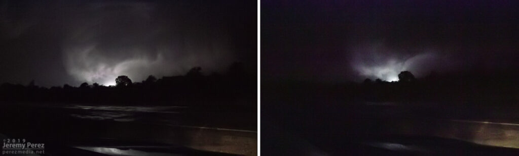 With my brain fried by technical issues and a ton of missed shots, I couldn’t actually tell that the storm was producing, other than it had developed a huge, incredibly solid wall cloud slanting above the trees. I didn’t pick up on the power flashes visually at the time, but the camera caught one as it illuminated the tornado in progress about a quarter mile northeast of where the first damage markers were surveyed. My daughter was running the video camera and picked up a couple more power flashes after that. We didn’t get an actual visual on the condensation funnel until about 20 minutes later as it was backlit by lightning as the storm was racing off north of Golden City.