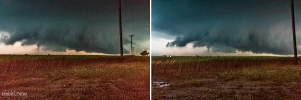 We paced it for a while, but terrain and trees gradually became a huge problem as we got east of Lockwood. We made our way back west to the next day’s target in the Texas Panhandle, dodging heavier cores and flooded roads along the way during a very long night of driving.