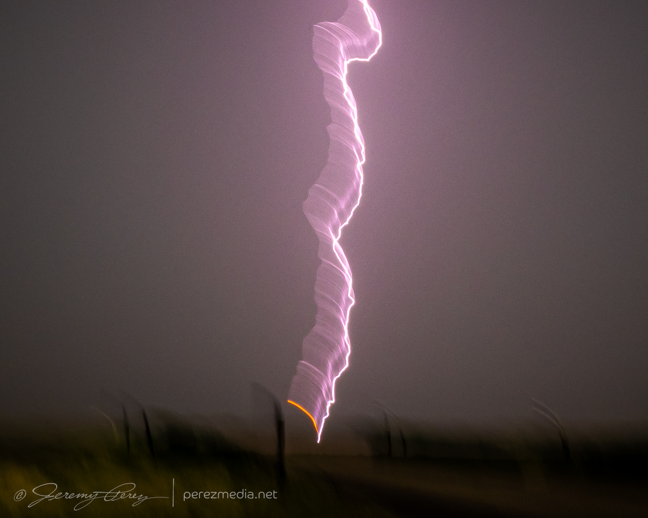 As the outflow flew by, I made some totally futile attempts to shoot some of the lightning happening inside all the flying rain. And just because of the way things work, most in-the-thick-of-it lightning will be firing in a direction that flings rain straight into the car and camera. Which means window mounting the camera is no good. So I sometimes try hand-holding the camera further back away from the window. There are pretty low odds of getting something good that way, although it’s worked out a few times so I’m always tempted to give it a shot. Anyway, this last image was of the one strike I did manage to catch, in all it’s motion-blurred glory. It landed ever so close and for whatever it’s worth, the extreme motion blur highlighted the orange plasma at the landing point really well.