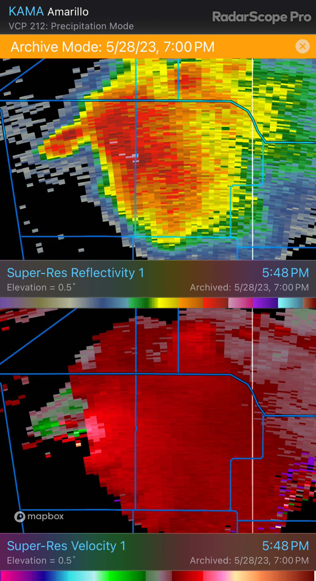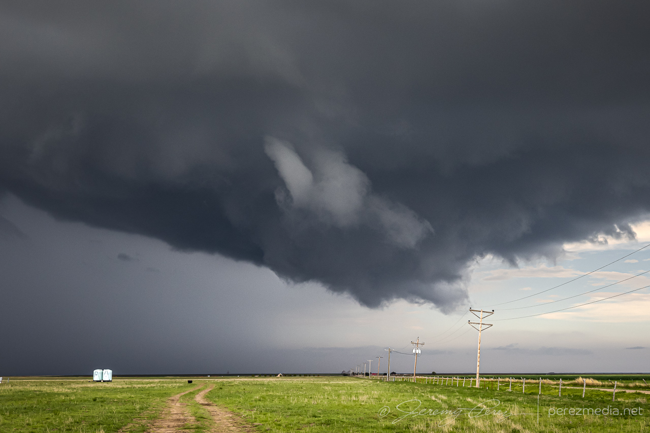 Around 00Z, a third cell to the west-northwest was rapidly strengthening and moving westward. It was starting to rain into our storm’s updraft and likely to become the main show next. So we cruised west and then north on CR119 to catch up. It was looking especially interesting with a lumpy inflow band running along the forward flank toward the updraft. Eventually, that inflow band stretched out and started showing streamwise vorticity current structures along the shelf.