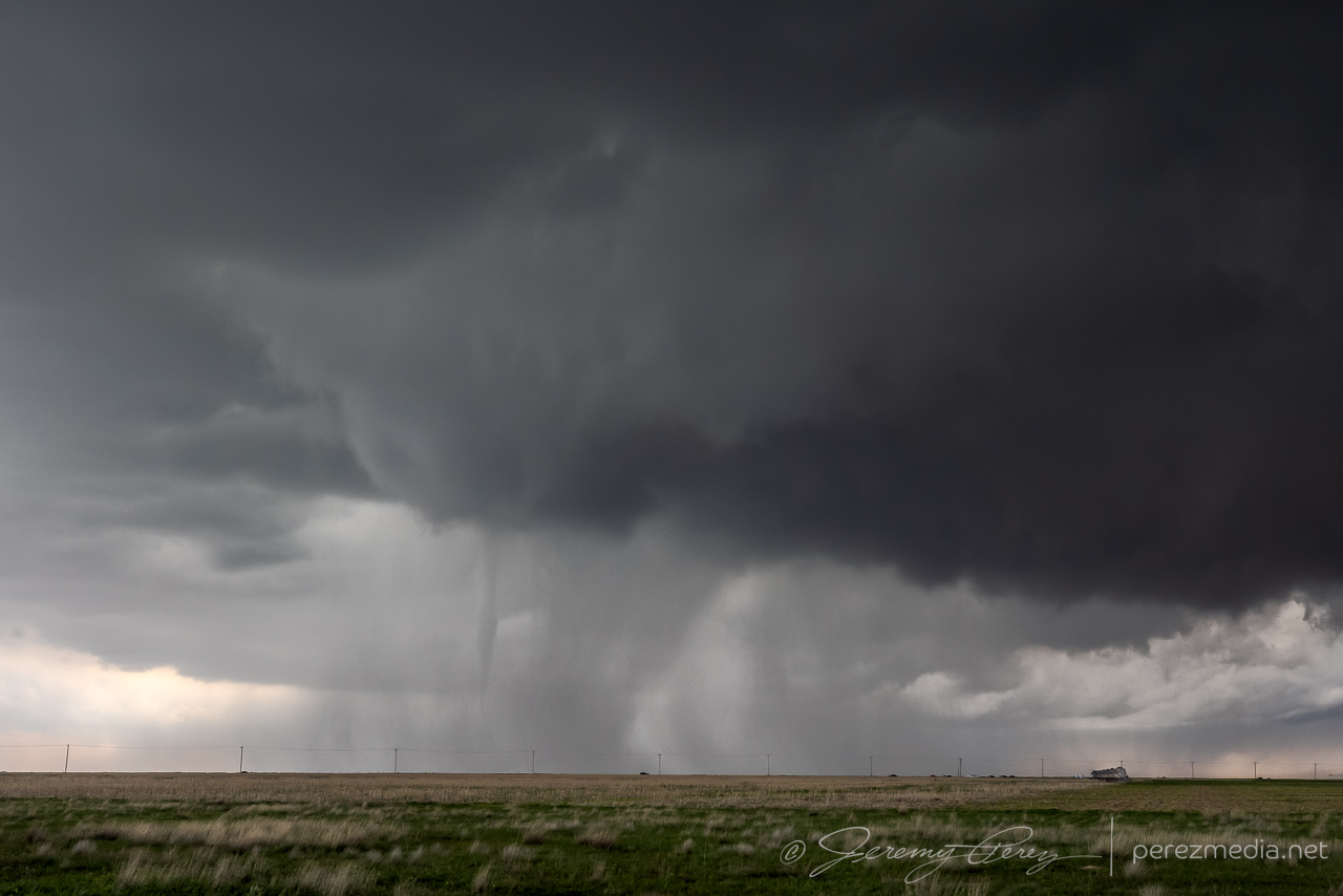 Gradually, the lowering grew more focused, and we took our stand about 8 miles down the road. Over the next 3-4 minutes, a funnel consolidated, lowered, and then the tornado fully condensed. This road turned out to be a great spot to watch tornadogenesis about 2 and a half miles northwest as the storm slowly grooved right to left. The tornado lasted around 7 minutes before fading out as a thin hazy rope inside the occluded precipitation.
