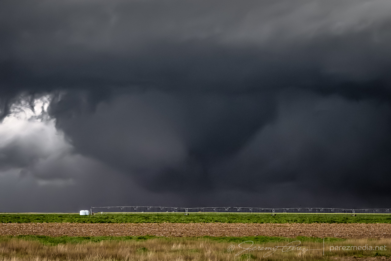 As quickly as the outflow boundary was hustling west while our storm drifted north, I initially thought the airmass behind the boundary would be more stable and would wither our storm as it fell behind. But that is definitely not what happened. The boundary had more than enough time to modify — I just had a predisposition to equating any fairly progressive boundary with cooler, stable air pushing in behind it. Our cell continued to strengthen and graduated to developing a mesocyclone and an absolutely perfect, rotating wall cloud. That was definitely not on the roster for the day and I was only to happy too switch modes and enjoy and capture every bit that I could.