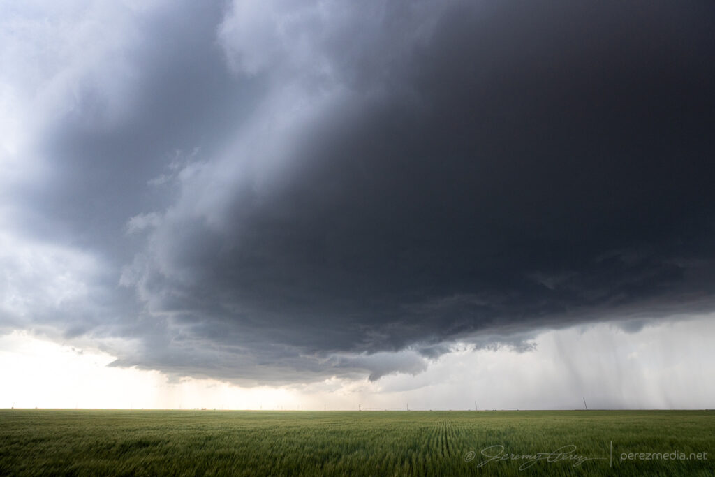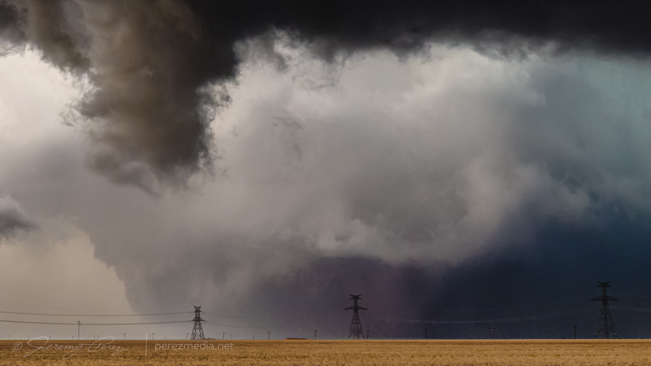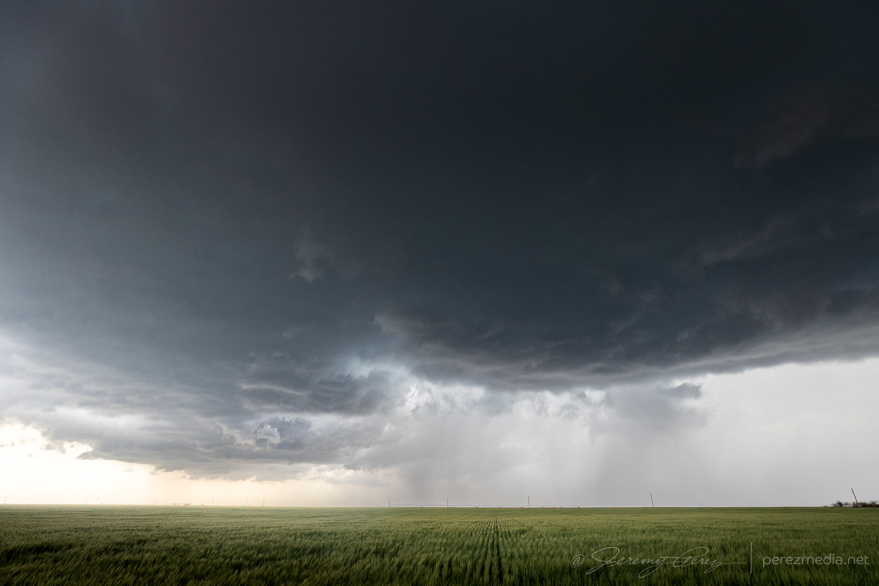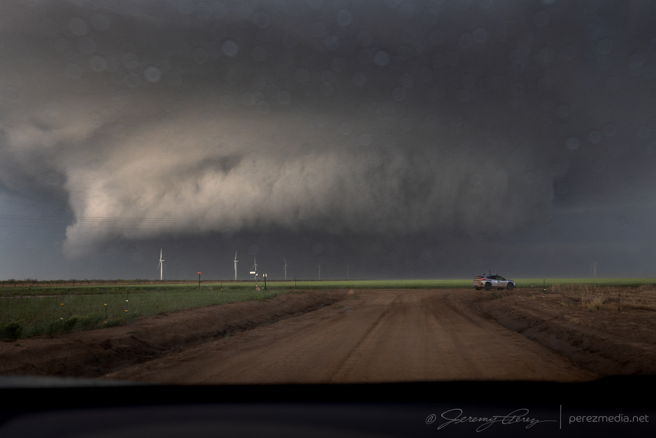 I made it down to CR178 and then back east toward the storm. After pushing through the haze, an impressive, rapidly spinning wall cloud appeared straight ahead.
