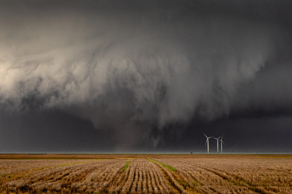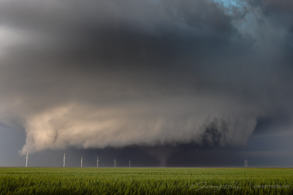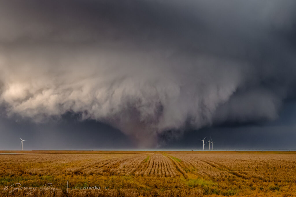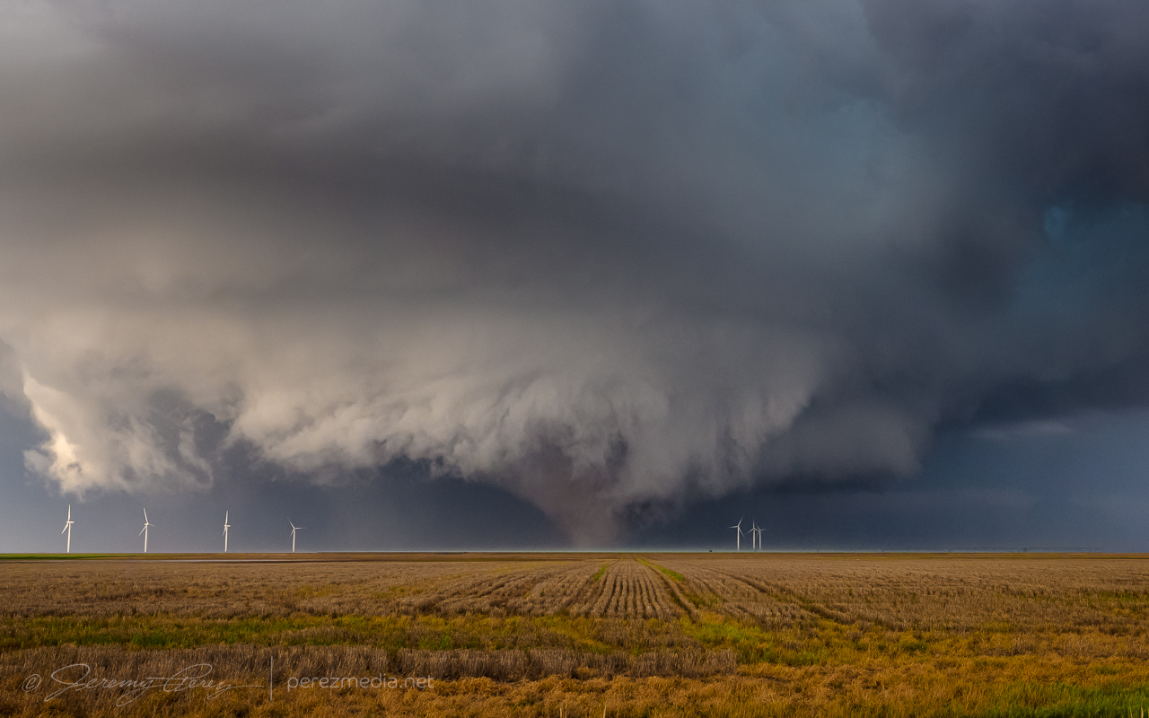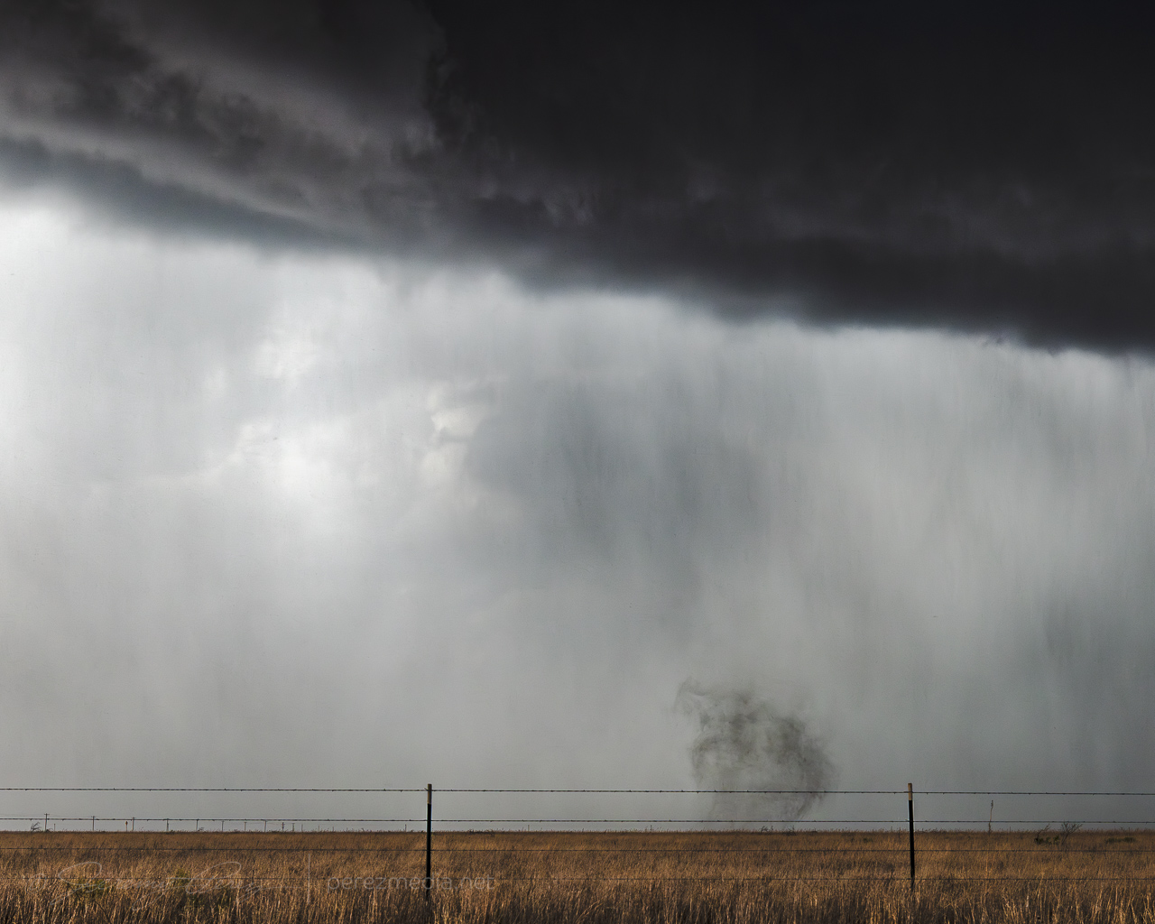 I turned south at CR271 and started grabbing video and stills as a tornado emerged from the shadows. As it widened, turbulence at the base revealed churning subvortices. Just as I was trying to lock in the video camera on the window mount, the ball head lock nut loosened up and all the camera wanted to do was fall to the side. Getting simultaneous video and stills was huge challenge with that going on.