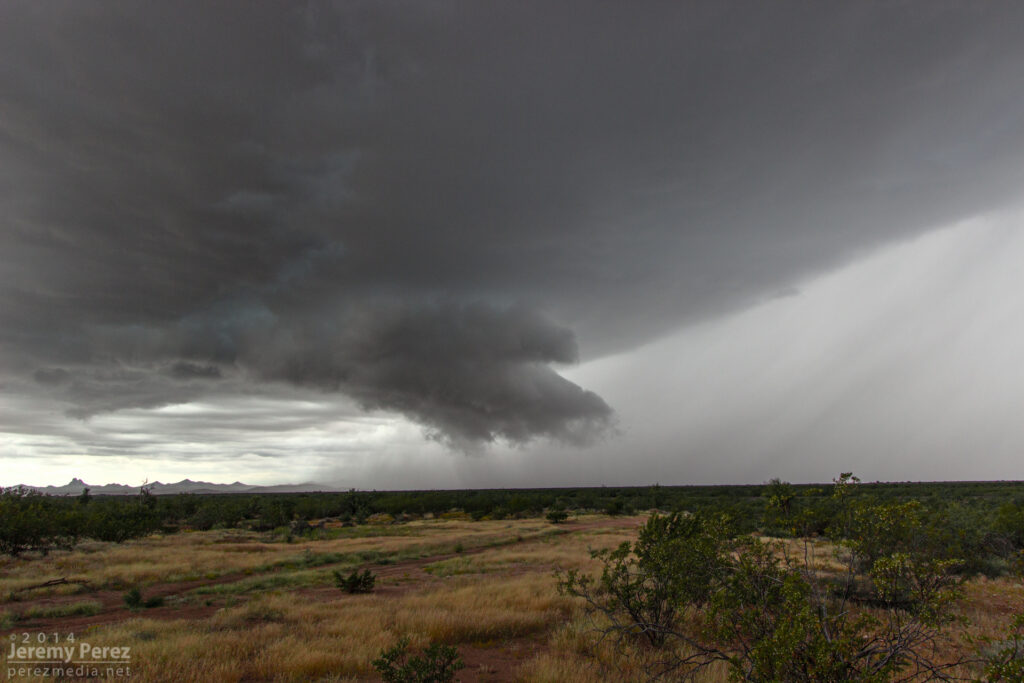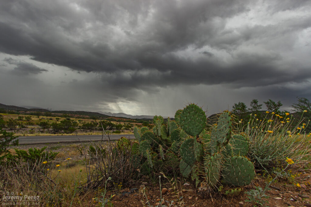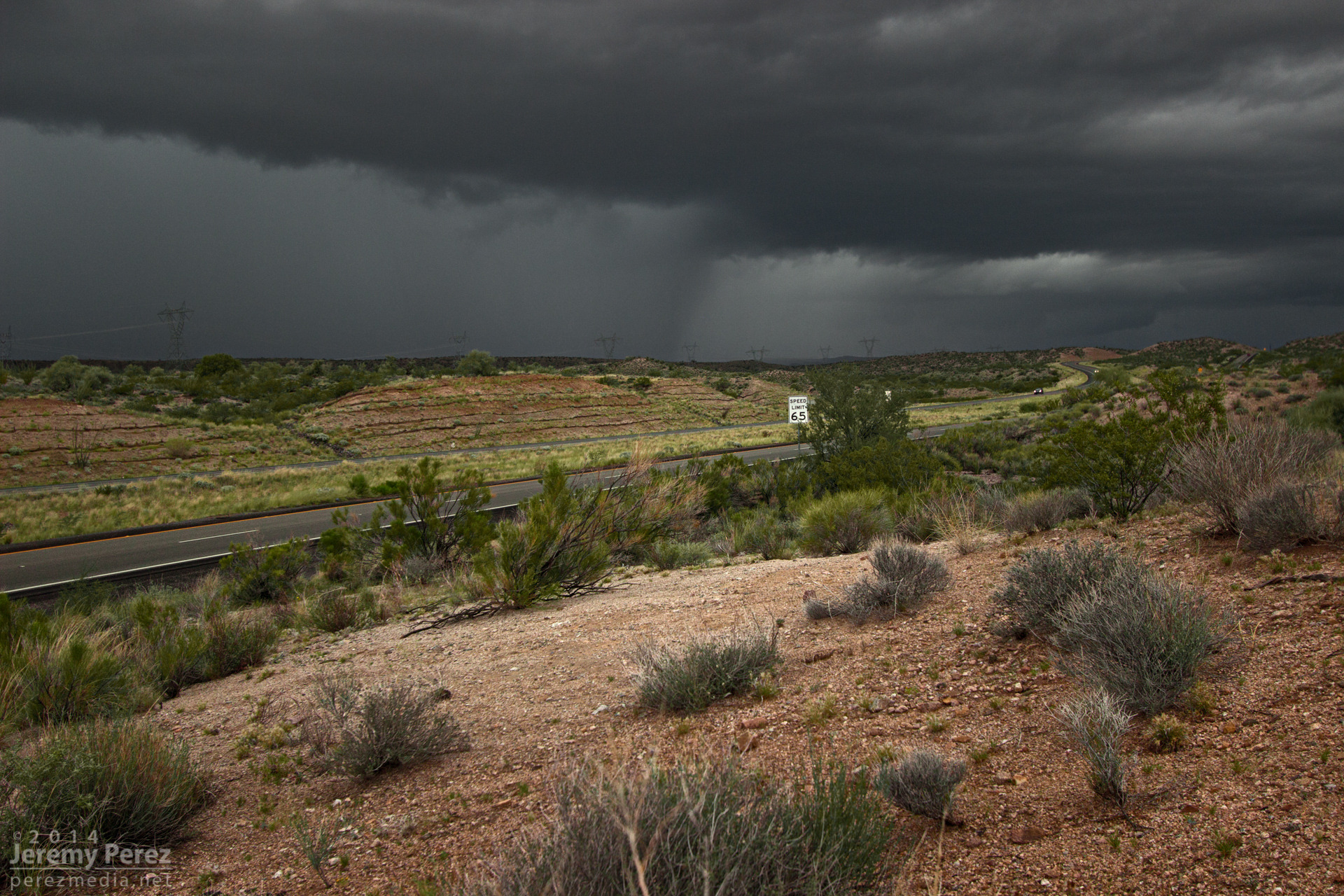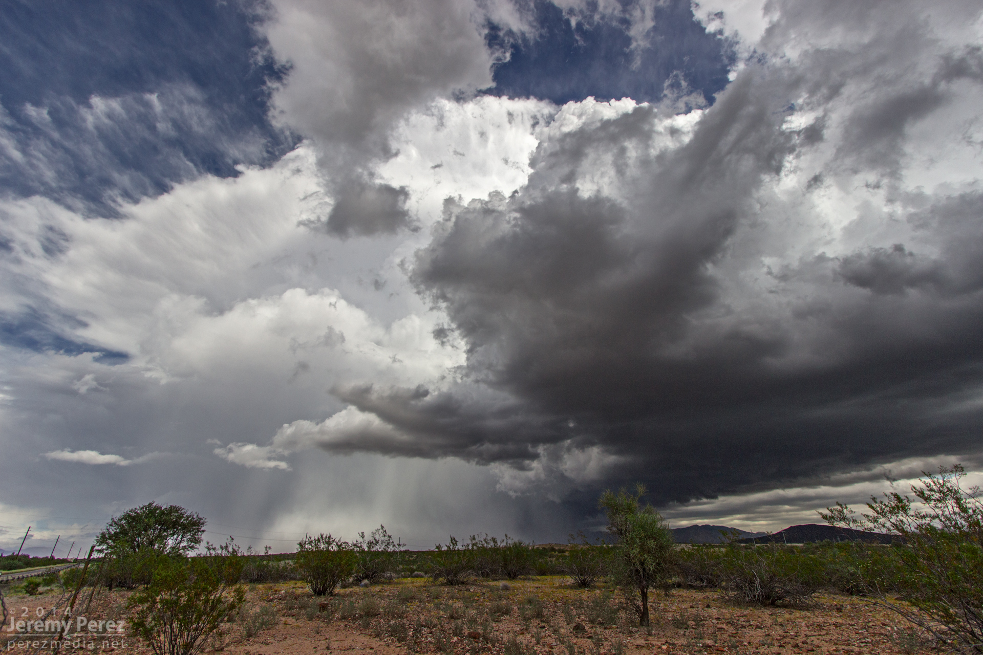 After that amazing encounter, I headed further south to get in front of some more developing convection. Along the way, I caught brief views of stronger updraft bases between precipitation cores, and irresistible stormy views in the desert terrain.