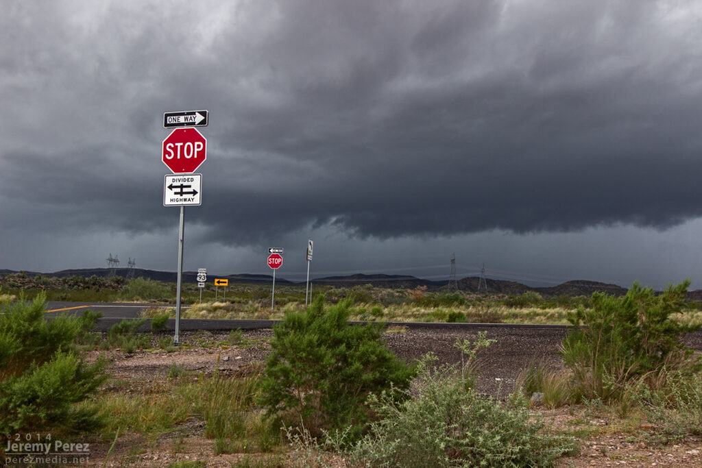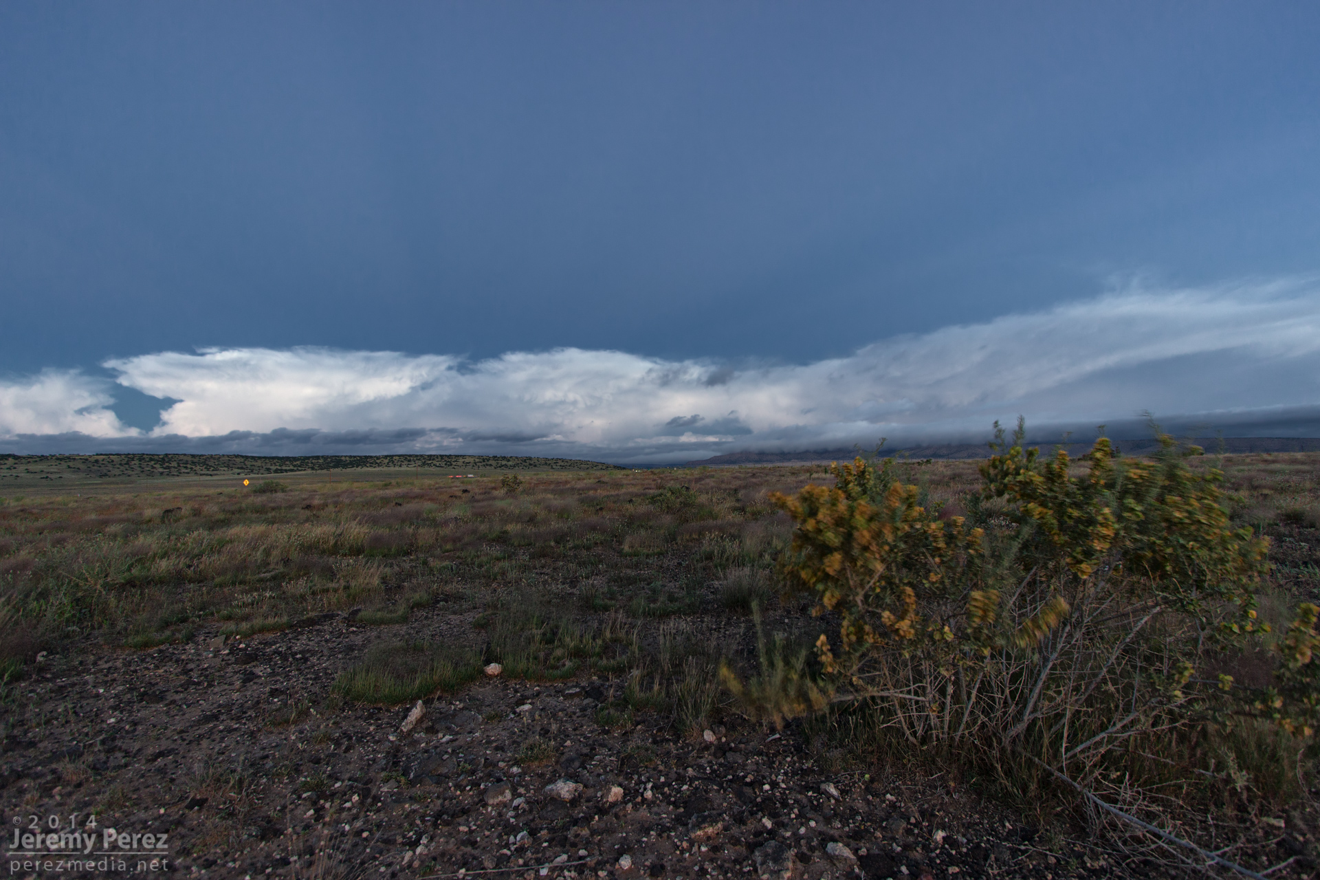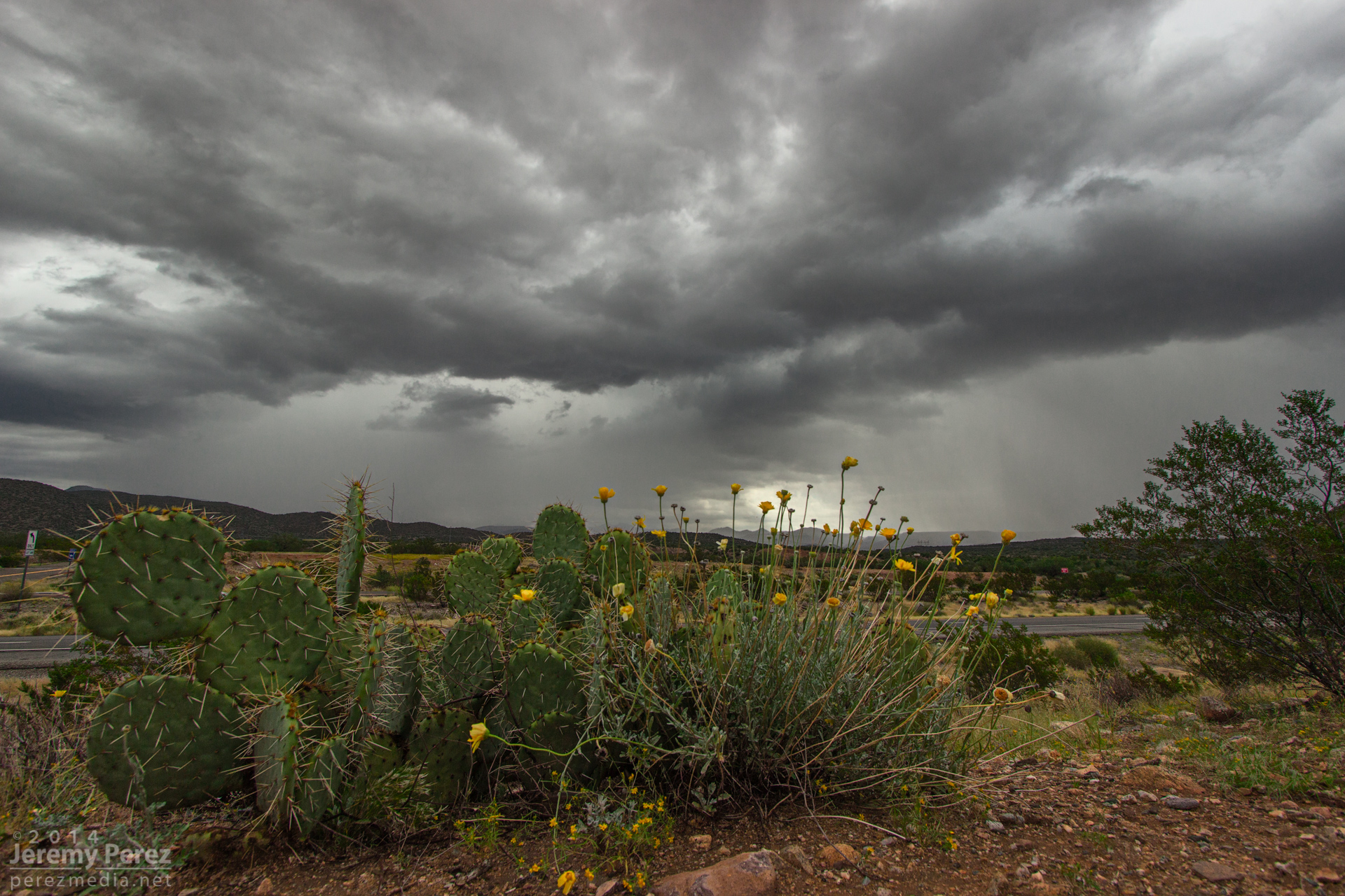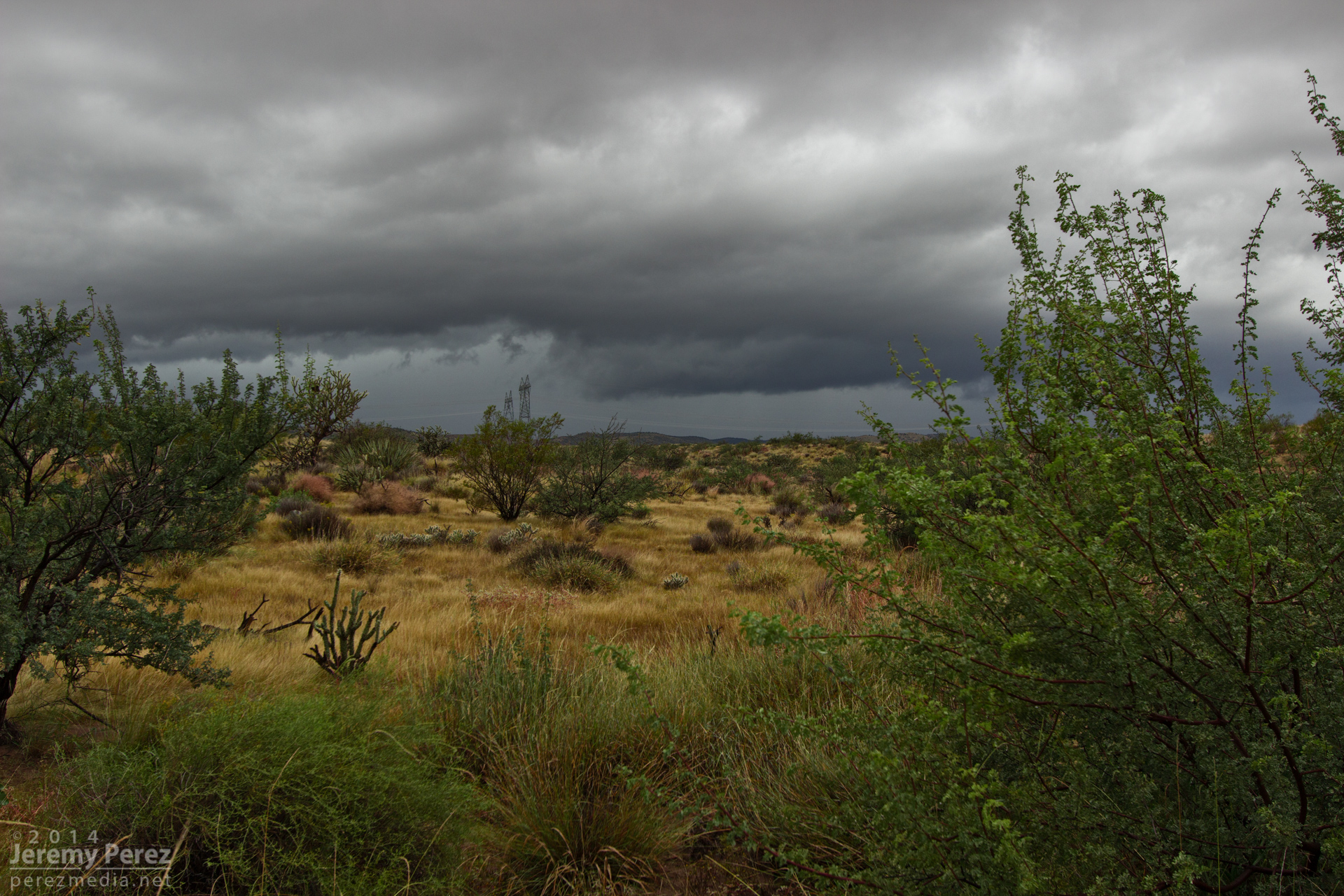 After that amazing encounter, I headed further south to get in front of some more developing convection. Along the way, I caught brief views of stronger updraft bases between precipitation cores, and irresistible stormy views in the desert terrain.