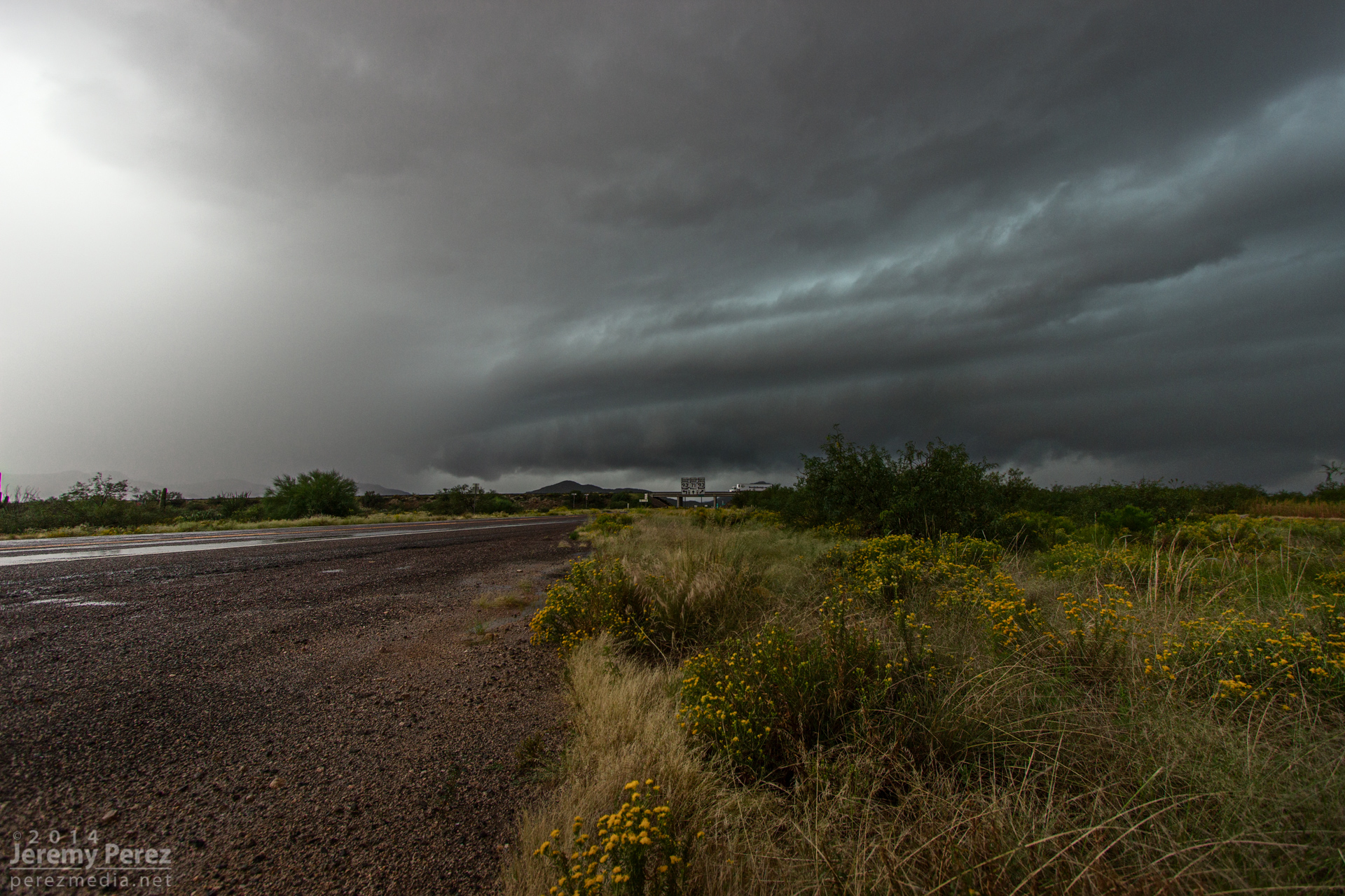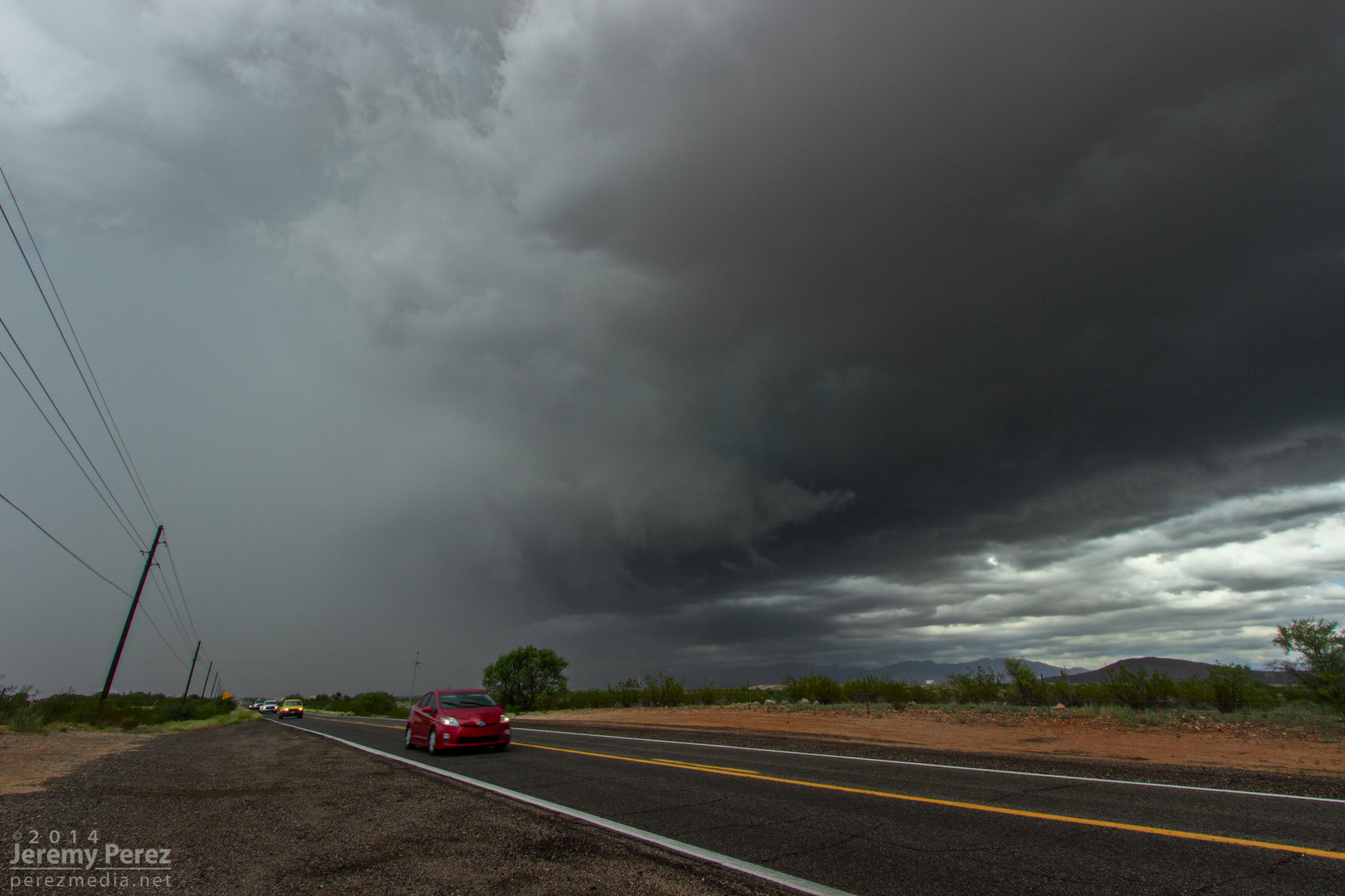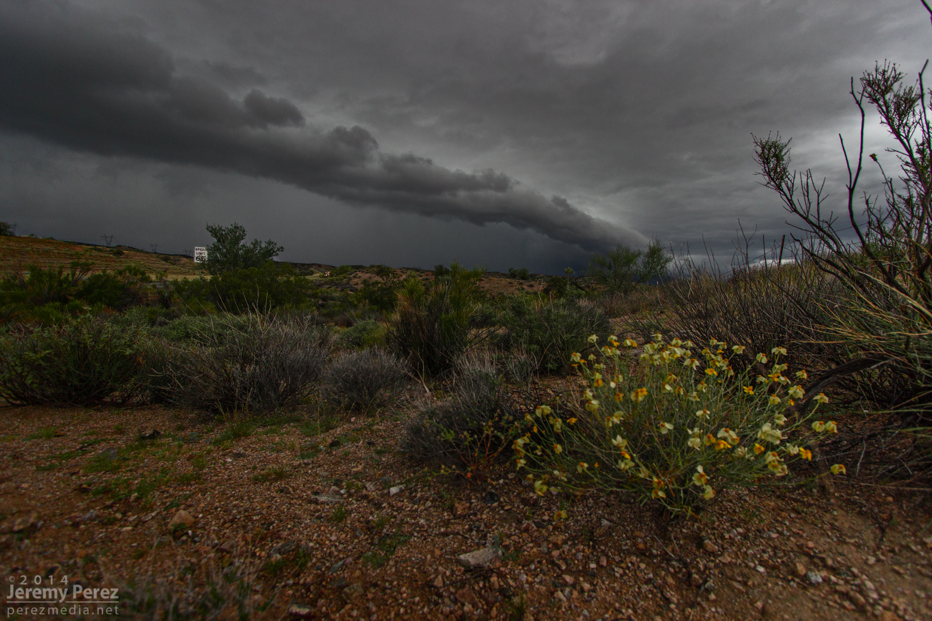I was so busy trying to coordinate video and photography, and keeping track of overall storm motion that I couldn’t relax and see if any slow rotation was present. At this point, if there was any rotation in the wall cloud, it wasn’t fast enough to make me think it was about to plant something out in the mesquite and palo verdes. However what was concerning is that the storm was turning even further to the right and I had to hustle out of the way. As I raced south, I started getting shoved around by RFD that was starting to fill in with rain. Once I was clear, I got view of the back of the RFD core and right edge of the wall cloud as it moved away.