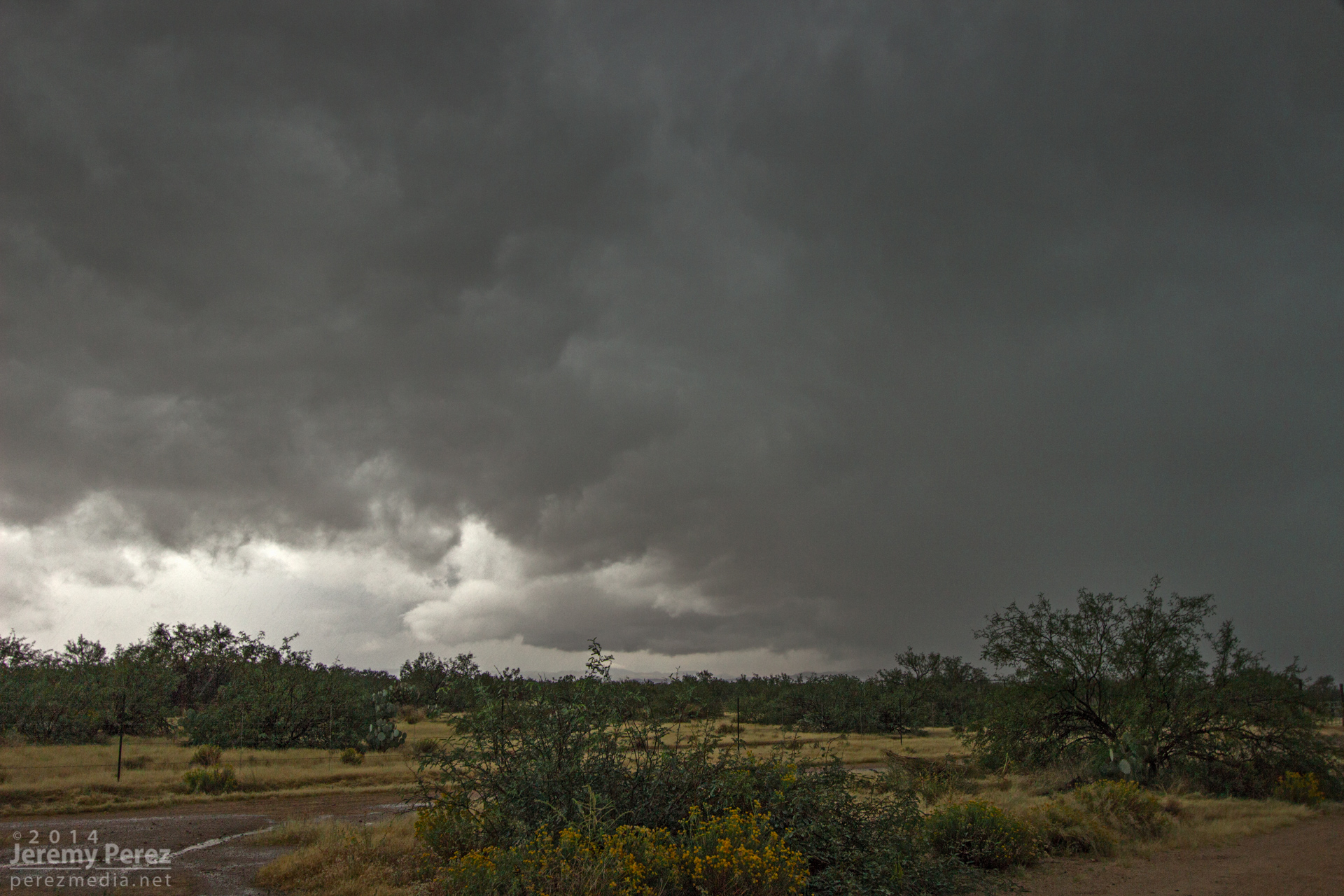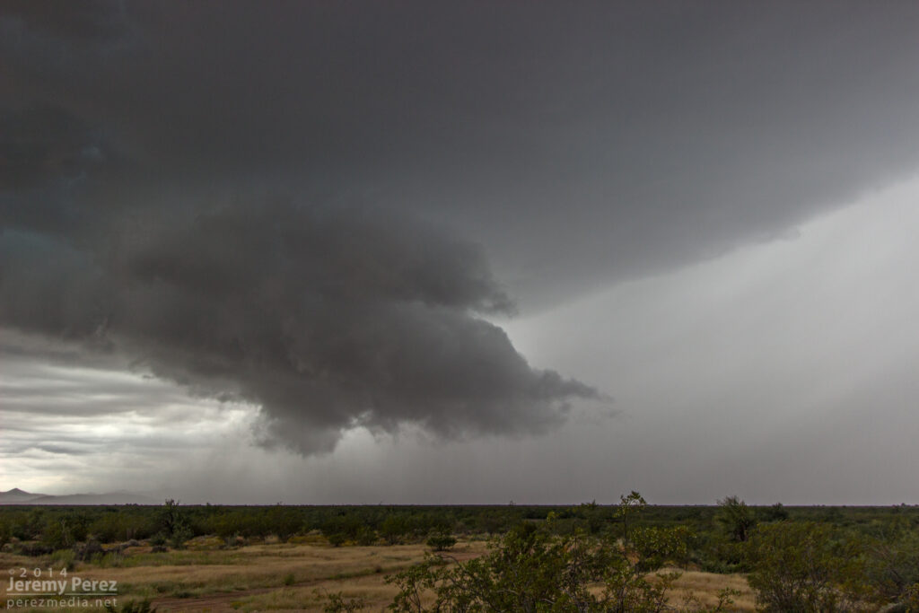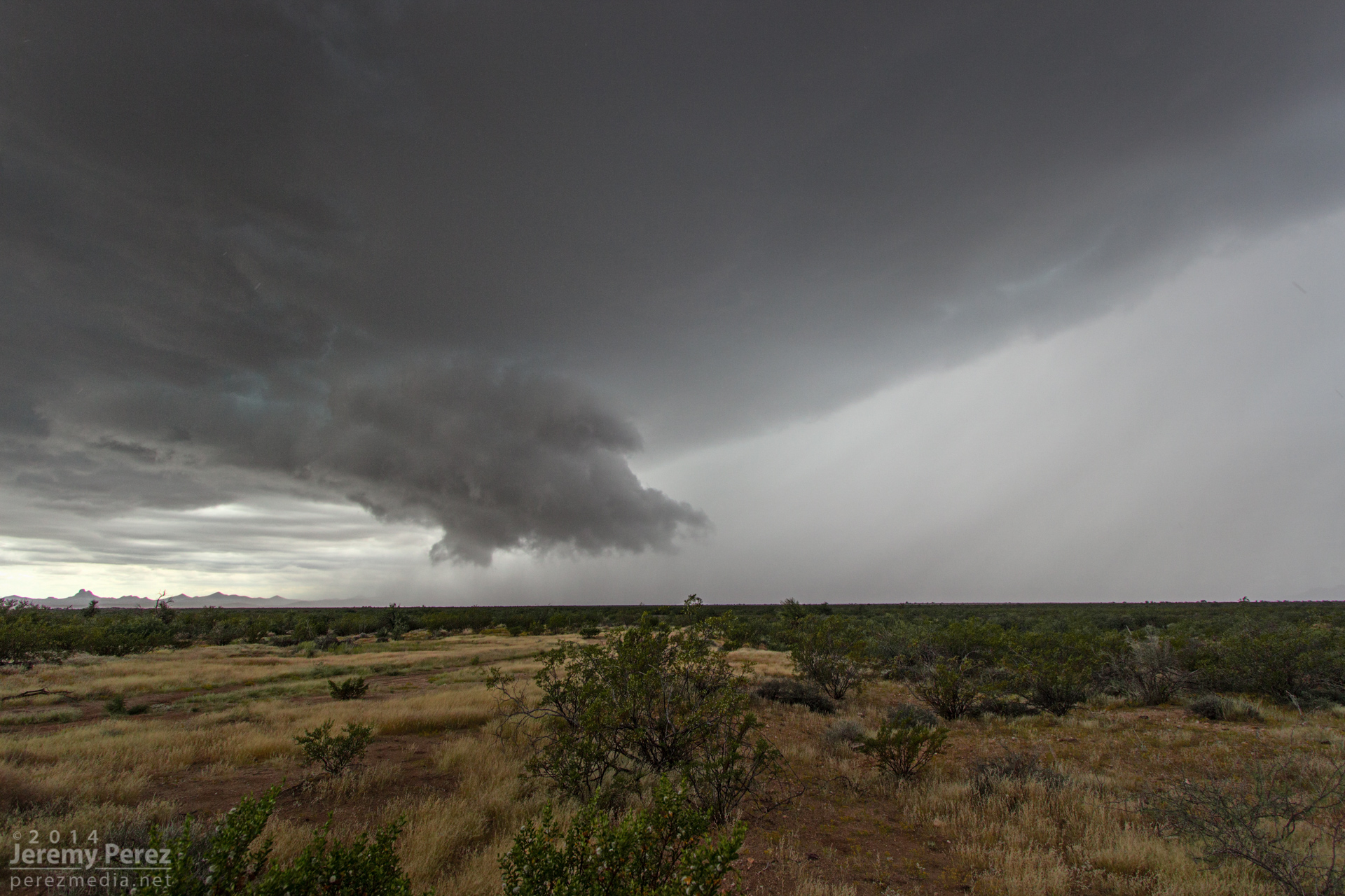 I was so busy trying to coordinate video and photography, and keeping track of overall storm motion that I couldn’t relax and see if any slow rotation was present. At this point, if there was any rotation in the wall cloud, it wasn’t fast enough to make me think it was about to plant something out in the mesquite and palo verdes. However what was concerning is that the storm was turning even further to the right and I had to hustle out of the way. As I raced south, I started getting shoved around by RFD that was starting to fill in with rain. Once I was clear, I got view of the back of the RFD core and right edge of the wall cloud as it moved away.