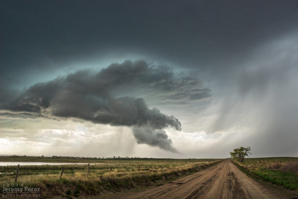 While photographing it, I noticed that the storm appeared to be deviating a bit to the right. So I jumped back in the car and headed further south to avoid getting cut off. During that short drive, the wall could got sturdier as it made attempts at a tail cloud along the interface of a the forward flank. It reminded me a lot of another beautiful supercell I intercepted in Wyoming back in May.