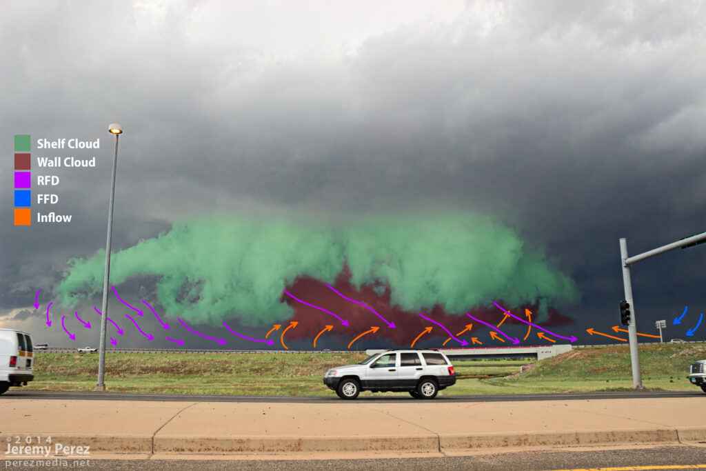 What I especially wanted to work on were transition points in space or time where a shelf cloud is merging or morphing into a wall cloud/tail cloud and vice-versa. A lot of times it’s pretty clear what’s what. But because the storm and its environment don’t care about taxonomy, there are plenty of cases where things ride along a diffuse spectrum. To me, it’s educational to watch these things unfold and look for transitions where one thing becomes another, and what that means for the fluid movement and interaction of near-storm air masses.