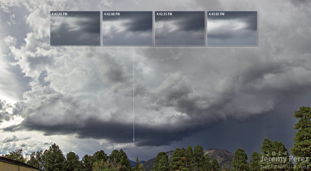I noticed some laminar striation under the base, but thought it was just an indication of strong inflow. After checking the photos, I noticed that structure may have actually been a shear funnel that lasted a little more than a minute from 4:42 to 4:43 PM.
