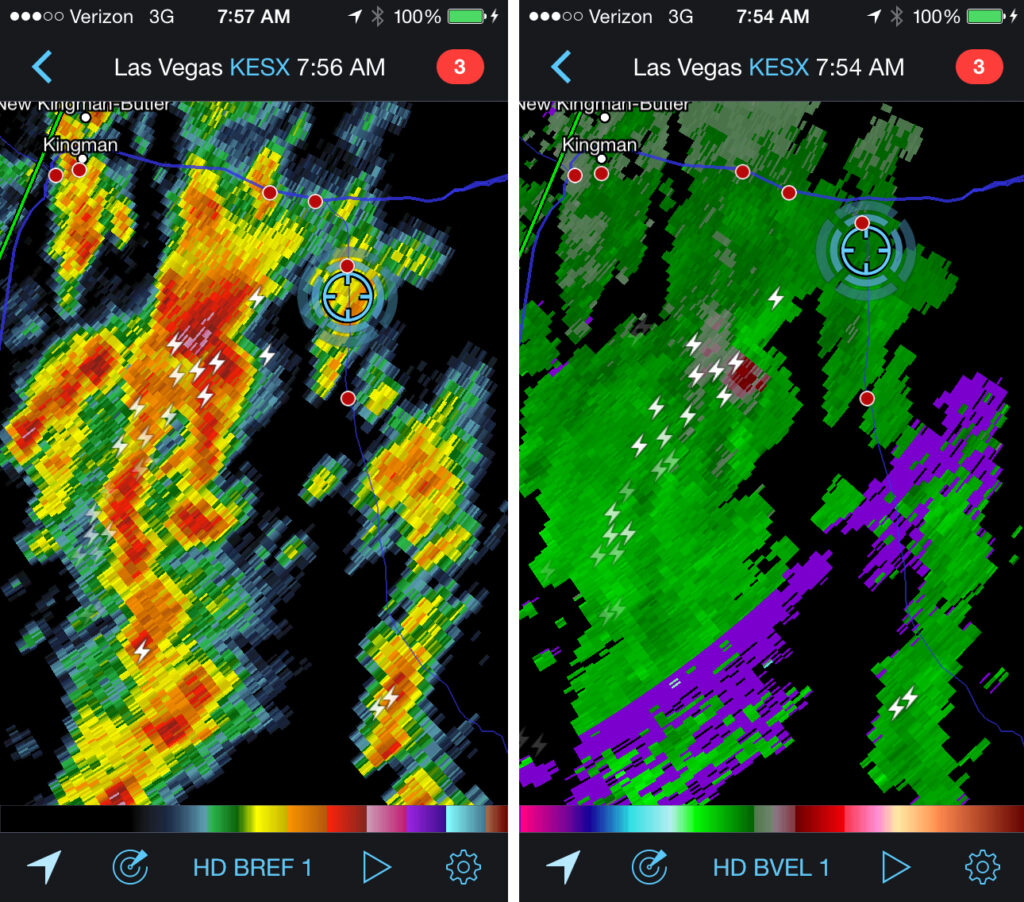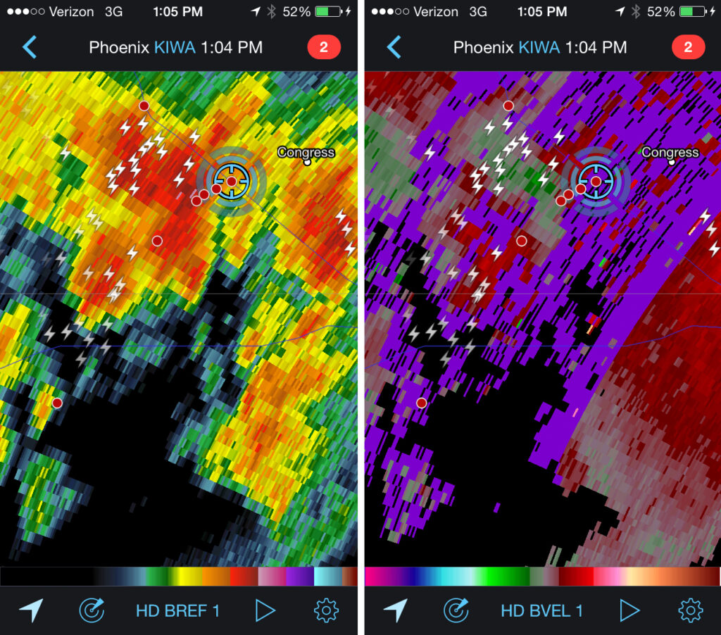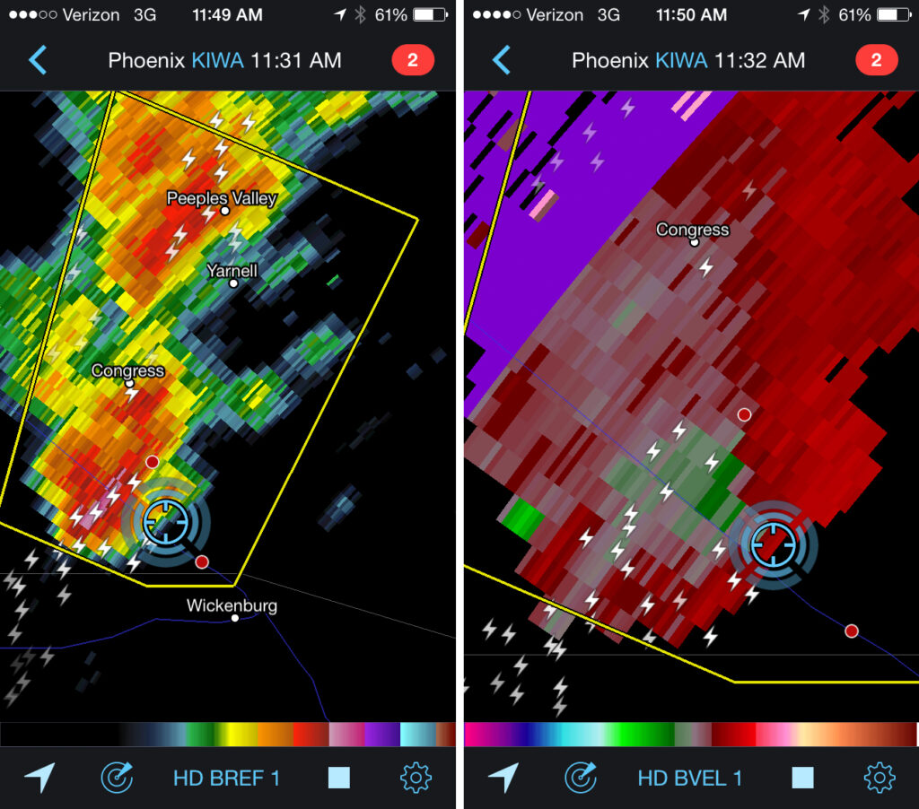 Wall cloud on a supercell north of Wickenburg. As seen from Highway 89 facing southwest. 11:30 AM / 1830ZReflectivity and velocity radar of the Wickenburg supercell. 11:32 AM / 1832Z