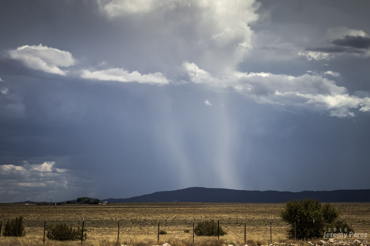 I got about three miles in, before the likelihood of getting stuck and busting my car in the rocky, cratered road became too great. I stopped and found a spot to hike up a hill to get some shots of a pretty decent cell popping up north of the Peaks by that time. Lots of terrain mostly blocked the view as it continued eastward and joined a strong line of storms that moved off onto the Navajo and Hopi Reservations.