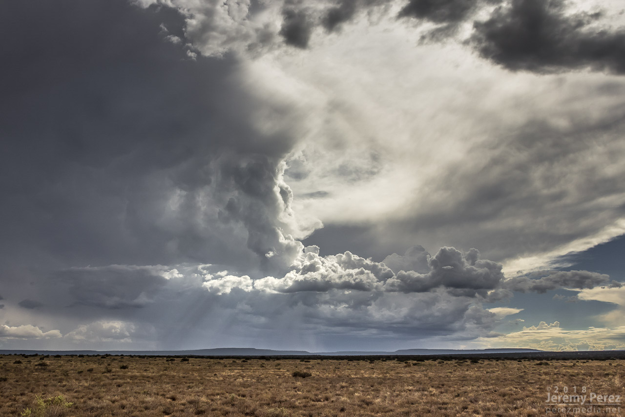 Around noon, I followed a strong cell east out of Flagstaff as it drifted along north of I-40. I managed some time lapses south of the Twin Arrows/I-40 exit as it was draping a shaggy shelf cloud around its core. I paced it further east to Buffalo Range Road where it ran into a boundary being laid down by another line of north-south convection to the east. The interaction worked some beautiful structure into the updraft of the original cell before it merged, mushed and gusted out. I tried for some more convection further north on the AZ-87 toward Dilkon. Nothing strong materialized, but the landscape was stunning against the tattered sky.