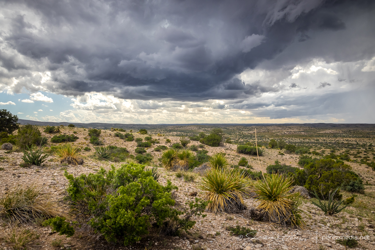 Back on Highway 62, I headed south, watching for vantages as outflow hopefully kicked off more good things off to my west. I eventually found an unpaved service road off the side of the highway that lofted up to a great high vantage point. Convection way off to the west was filtering down a stunning display of crepuscular rays while the southern tip of Guadalupe Mountains National Park anchored the scene on the edge of the precipitation. I hadn’t been here before, and that landmark reminded me a lot of the Superstition Mountains east of Phoenix.