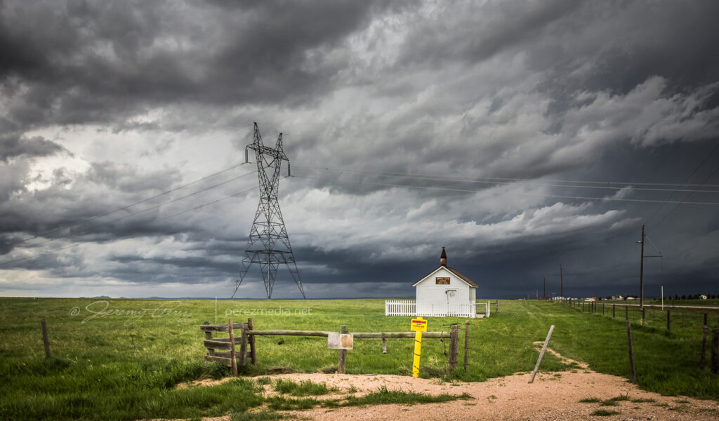The cell was aiming north of Cheyenne, so we made our way to the north side of town and headed west on Horse Creek Road then about a mile further down Romsa Road to get a look as it moved in. Along the side of the road we saw a restored Wyoming schoolhouse with a sign saying, “Capitol Vista School 1919–1936.” Usually the old structures we see while chasing are a complete mystery.