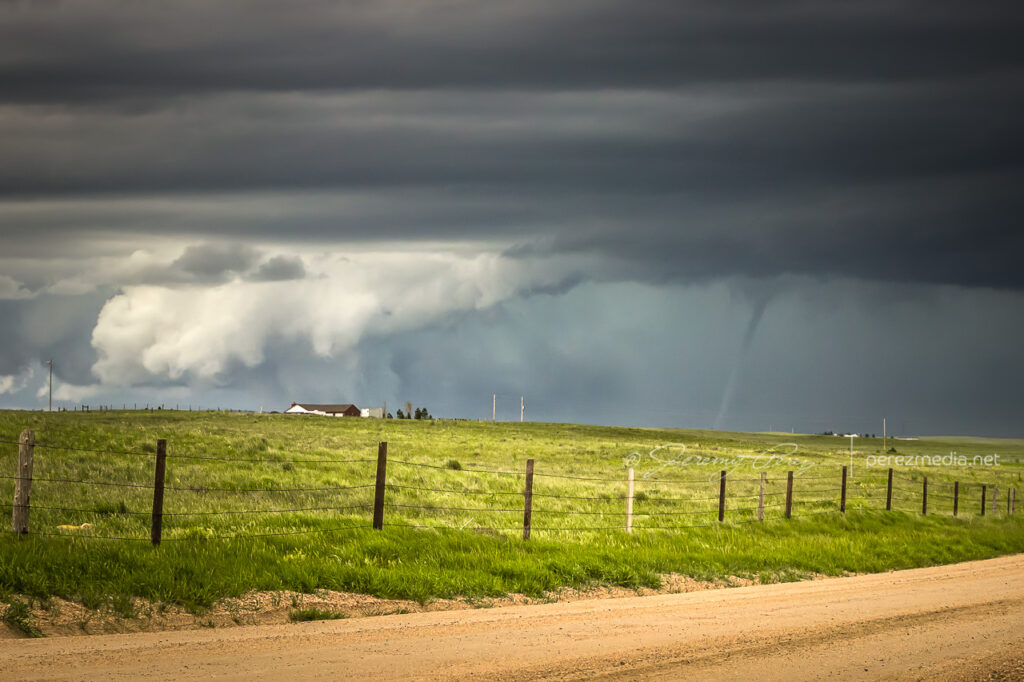 From our vantage, we couldn’t see ground contact across the distant rise, but it was confirmed tornadic. It only lasted four minutes or so before dissipating and we headed back east and then north on I-25 to get our next visual. Heading north, a new tornado formed to our left and tightened up into a thin soda straw as we hopped off the interstate at Ridley Road for quick shots before it evaporated.