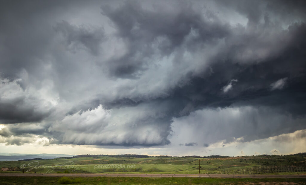 We headed further up I-25 and had a view of rotating RFD beneath the storm from Whitaker Road. The view wasn’t good enough to make out what was happening back in there, but the storm looked great and was very ominous by this point.