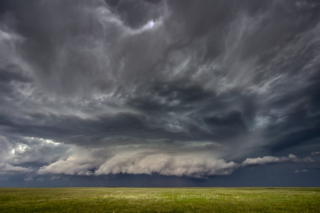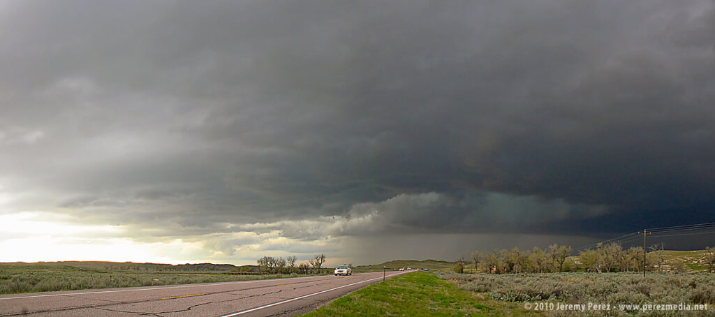 We took US-85 north of Lingle, and caught fractured glimpses of the disintegrating wall cloud between otherwise stunning, hilly terrain. When we finally caught up to it, the wall cloud was gone, although the base was still slowly rotating. A deep, turquoise light emerged from within.
